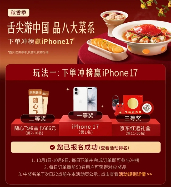 今年的佳节团圆餐,京东外卖还特地推出了三大福利活动,其中最受关注的便是“下单冲榜赢 iPhone17”,从10月1日开始,每日订单数前 50 名的用户均可获得重磅奖励,包括苹果新机iPhone17、价值666元的随心飞套票以及京东红运礼盒等众多大奖。