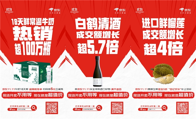 全球美味汇聚京东11.11,为消费者带来一口新鲜。主打“18天鲜”的常温牛奶在京东11.11期间已售出超100万瓶;京东生鲜产地直采的进口鲜榴莲成交额同比增长超4倍;京东全球购汇聚全球百年品牌,白鹤清酒成交额同比增长超5.7倍。