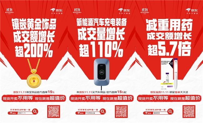 京东11.11的消费热潮覆盖衣食住行全方位。在这个京东11.11,兼具保值属性与时尚美感的镶嵌类黄金饰品备受消费者青睐,成交额同比增长超200%。随着绿色出行普及,新能源汽车充电装备成交量同比增长超110%。体重管理热潮下,京东买药减重用药成交额同比增长超5.7倍。