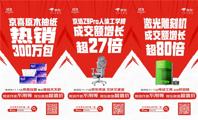 此外,极具性价比的京喜原木抽纸热销300万包、京东京造Z9Pro人体工学椅成交额同比暴增27倍。京东五金城自营入仓的激光雕刻机更实现了超80倍的成交额同比增长,成为“黑马”品类。