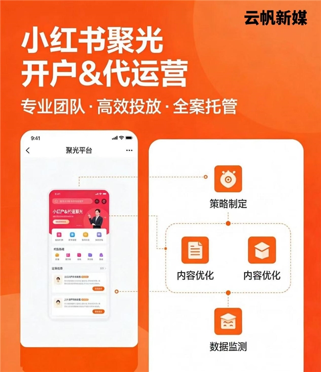 作为小红书聚光平台专业服务商,云帆新媒聚焦品牌投放痛点,打造 “低门槛启动 + 专业代运营 + 合规护航”核心优势,为美妆、母婴、家居、食品、教育等多行业品牌,提供从开户到效果优化的全链路小红书营销服务,大幅降低品牌入局门槛,提升投放转化效率。